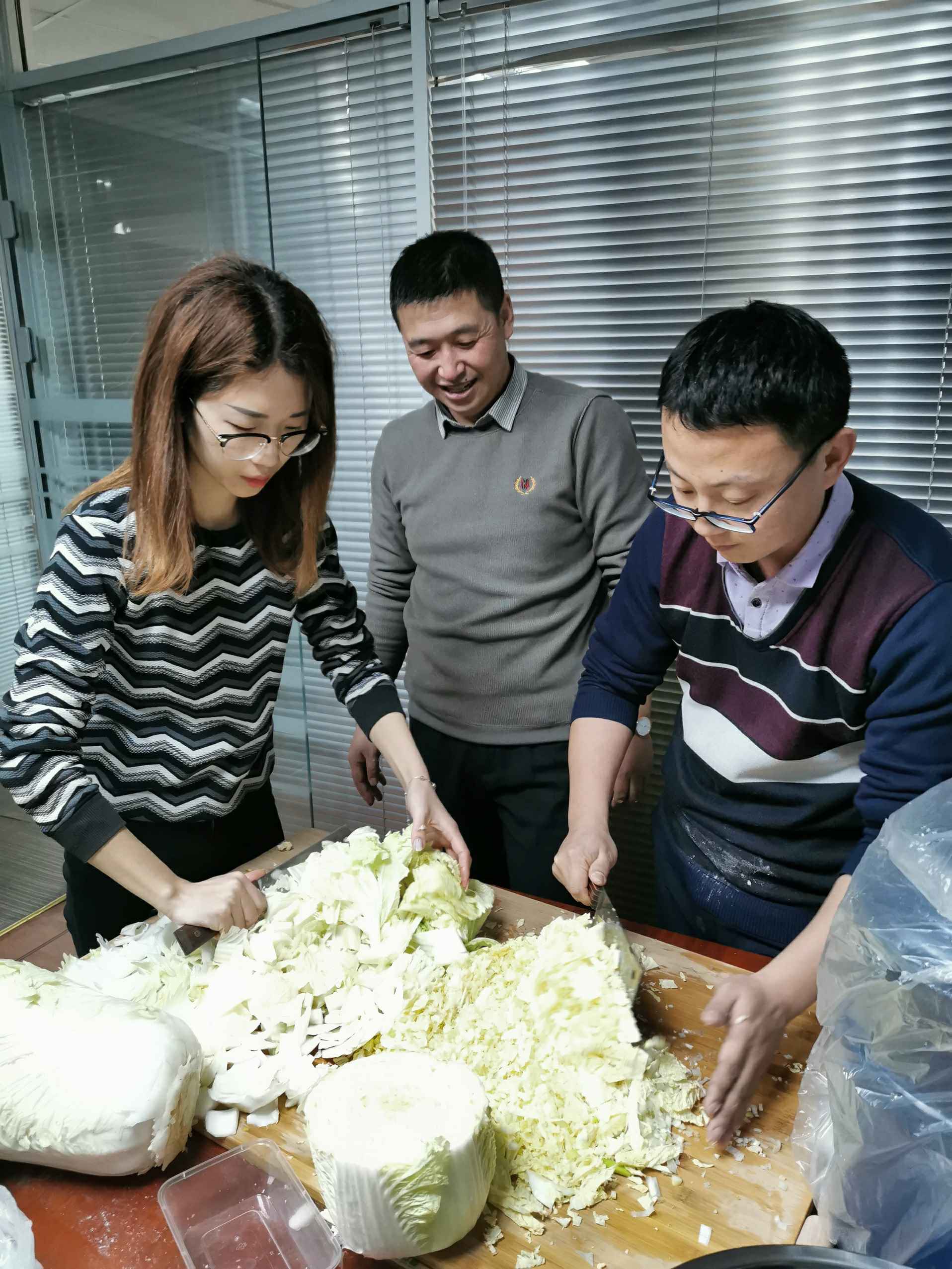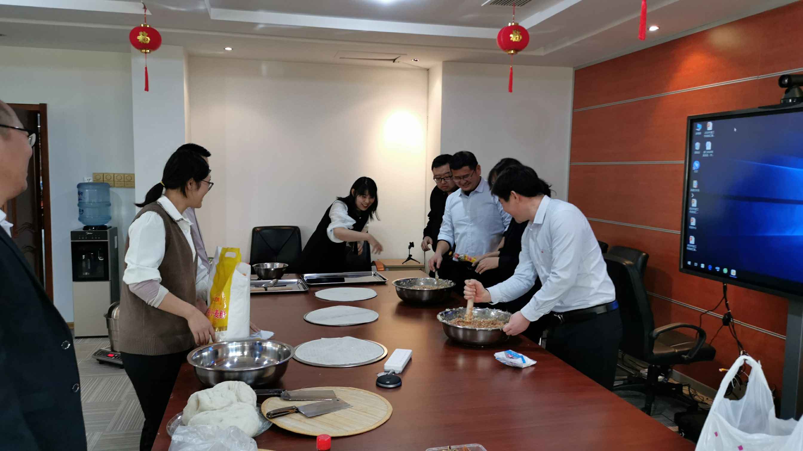 大家在欢声笑语中开始包饺子,和面,洗菜切菜,调馅,烧水,大家默契配合、互帮互助。